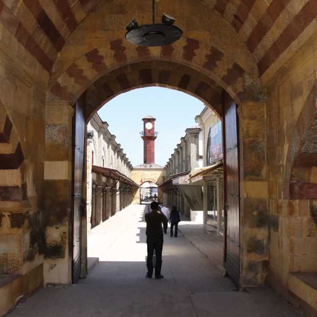 Tıkla veGörseli Büyüt:Kervansaray ve BedestenHacıyahya mahallesinde bulunan bedesten, dikdörtgen şekilde yapılmış olup dört kapıdan oluşmaktadır. Kırmızı ile beyaz renkli kesme taşlarla döşenen bu kemerli kapılardan yalnızca kuzey kapısı orijinalliğini korumaktadır. Bedestenin tamamı, koridorları boyunca dizilmiş dükkânlara ev sahipliği yapmaktadır.