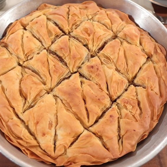 Soğan, patates rendelenir. Rendelenen malzemeler kıyma ile beraber bir tavada kavrulur. Kavrulan malzemelerin üzerine tuz, karabiber, pul biber ve ince kıyılmış maydanoz eklenerek soğumaya bırakılır. Hamur için un, su ve tuz karıştırılır. Katı bir hamur elde edilir. Cevizden büyük parçalara ayrılan hamur beze yapılır, nemli bezle örtülür. Bir miktar dinlendirilen hamurlar yufka gibi, nişasta serpiştirilerek açılır. Bütün bezeler incecik yufka olacak şekilde açılır. Yağlanmış tepsiye açılan yufkalardan bir tanesi konur, üzerine yağ gezdirilir. Açılan yufkaların yarısı aynı şekilde dizilir sonra hazırlanan iç harç tepsiye dökülür, her yerine eşit şekilde yayılır. Kalan yufkalar yağlanarak yine üst üste konulur. Yufkaların en üstüne yağ, yoğurt ve yumurtadan oluşan bir karışım yapılıp dökülür. Önceden ısıtılmış 180 derecelik fırında alt üst kızarıncaya kadar pişirilir.