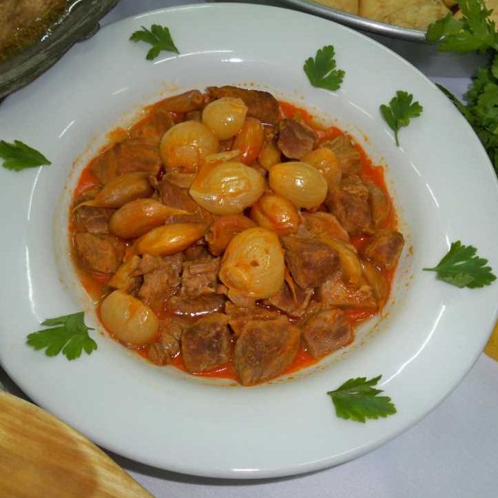 Tıkla veGörseli Büyüt:Sarımsaklı EtEt, kuşbaşı şekilde doğranır ve haşlanır. Haşlanan et yağ ve sıcak su eklenmiş tencere içerisinde yarım saat kadar pişirilir. Tencereye ince doğranmış soğan, kabukları ayrılmamış sarımsak, salça, tuz ve baharatlar ilave edilir. Sarımsaklı et yemeği bir süre daha pişirilir ve sıcak olarak servis edilir.