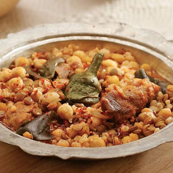 Aşurelik buğday ve nohut bir gece önceden ıslatılarak bekletilir. Et bir tencerede suyunu salıp çekene kadar kavrulur ardından su, kuru patlıcan başları, mercimek, aşurelik buğday ve nohut ilave edilir. Üzerinde biriken köpükler alınarak buğday ve nohutlar pişene kadar kaynatılır. Bu sırada soğanlar ince ince doğranır ve tereyağında salça ile birlikte kavrulur. Tuz ve baharatlar eklendikten sonra hazırlanan sos et ve bakliyatların piştiği tencereye ilave edilir, iyice karıştırılıp 10 dakika daha pişirilir.