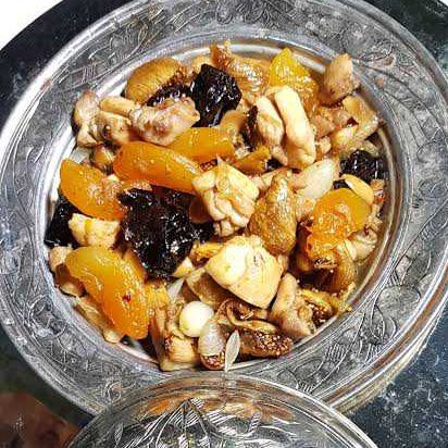 Bir tencereye, et ve yarım çay bardağı su koyup haşlanmaya bırakın. Ardında tuz ve 1 su bardağı daha su ekleyip etler yumuşayana kadar pişirin. Ayrı bir kapta, nişastayı bir miktar su ile eritin. İçine; ılıttığınız balı, bademi, üzümü, hurmayı, doğradığınız kuru kayısı, incir ve eriği koyup güzelce karıştırın. Altını kapattığınız etin üzerine nişastalı karışımı döküp tüm malzemelerin birbirine geçmesini sağlayın. Safranı da ekledikten sonra bir tur daha karıştırdığınız yemeği, servis tabağına alın. Haşhaş tohumu ilave edip ılındıktan sonra servis edin. Afiyet olsun.