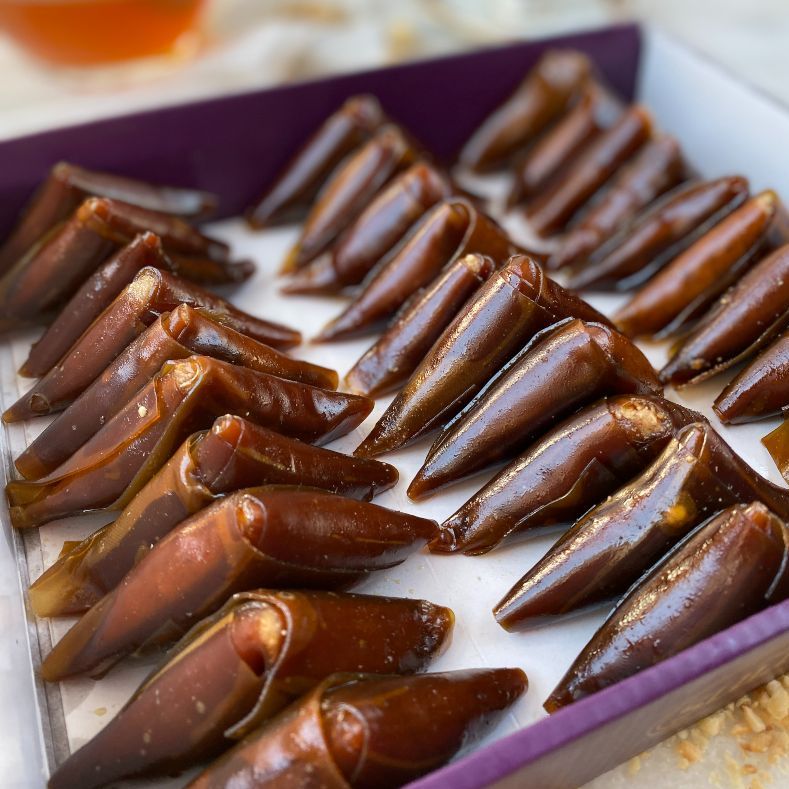 Tıkla veGörseli Büyüt:Muska TatlısıFındık işlenerek fındık ezmesi hâline getirildikten sonra yaprak pestile üçgen şekilde sarılır.