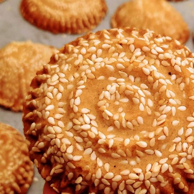Susam hariç tüm malzemeleri bir kaba alın. Ele yapışmayan bir hamur elde edene kadar yoğurun. Ardından hamurdan yumurta büyüklüğünde parçalar koparıp susama bulayın. Daha sonra kömbe kalıbına koyarak şekil verin. Kömbelerin tamamını fırın tepsisine dizin. 170 derecede ısıtılmış fırında, pembeleşene kadar pişirin. Afiyet olsun.
