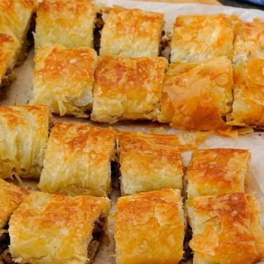 Kuş üzümlerini yıkayıp süzün ve ılık suda bekletin. Ardından soğanları yağda kavurun. Üzerine tuz ve şeker ekleyip bir süre daha karıştırın. Daha sonra kavrulmuş kıyma, karabiber ve kuş üzümünü de ilave ederek harcı tamamlayın. Ayrı bir yerde süt, yumurta ve sıvı yağı çırparak sos elde edin. Yağlanmış tepsiye serdiğiniz yufkanın üzerine bu sostan sürün. Üzerine bir kat daha yufka koyup aynı işlemi tekrarlayın. Harcın tamamını koyup kalan iki yufka için de aynı adımı takip edin. Böreğin üzerine de sos sürüp her iki ucundan katlayarak geniş bir rulo elde edin. 175 derecede ısıtılmış fırında, 35 dakika kadar pişirin. Afiyet olsun.