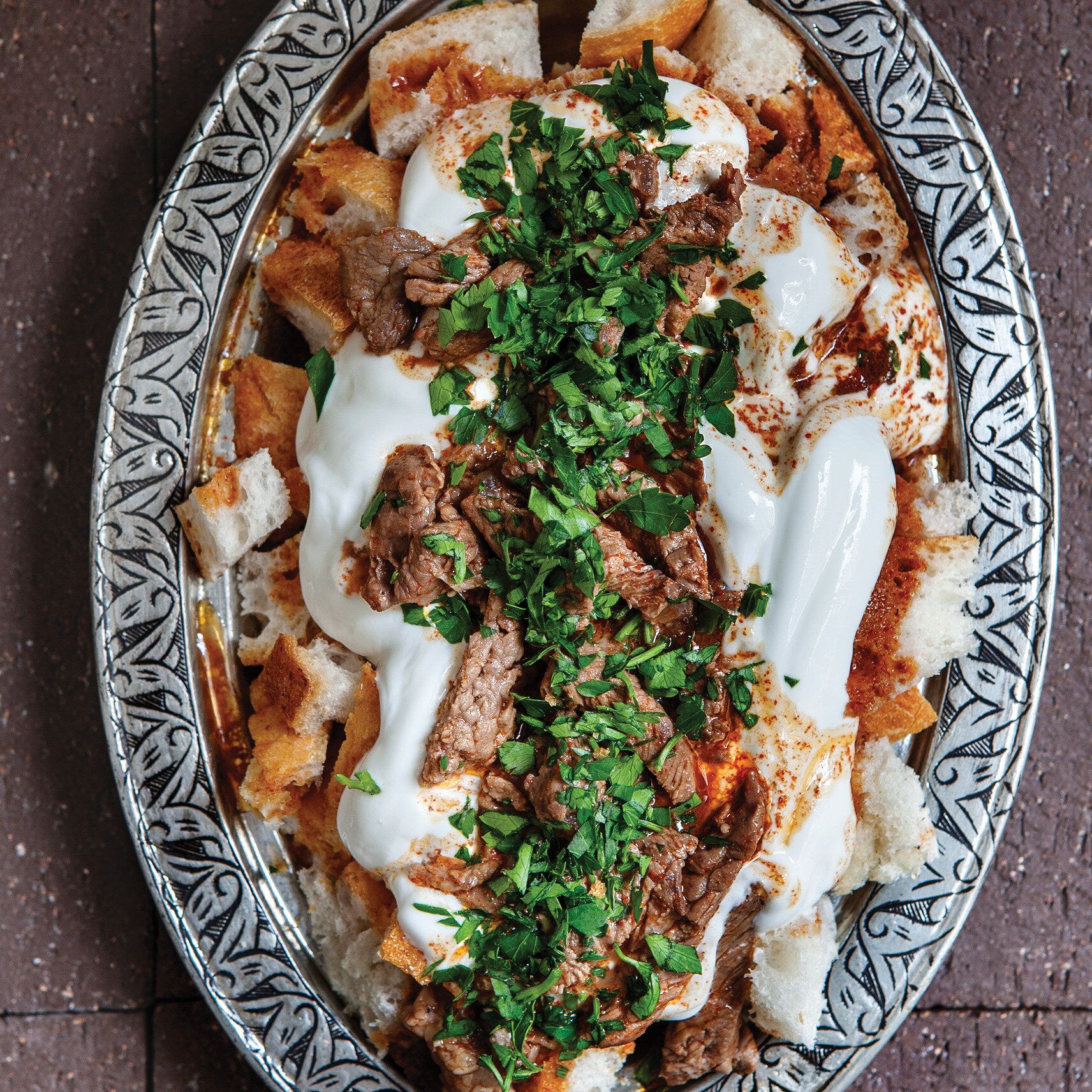 Tıkla veGörseli Büyüt:PaparaEt ve tereyağı tavaya alınır, et suyunu saldığında ocağın altı kısılır. Ardından tuz ve biber serpilerek tencerenin kapağı kapalı şekilde pişmeye bırakılır. Yoğurda dövülmüş sarımsak ve tuz eklenir, pürüzsüz bir kıvam elde edene kadar çırpılır. Küp küp doğranan bayat ekmekler servis tabağına alınır, üzerine etin suyundan gezdirildikten sonra hazırlanan sarımsaklı yoğurt dökülür ve didiklenen etler dizilir. Tekrar etin suyundan ve yağından gezdirilerek kıyılmış maydanozla süslenir.