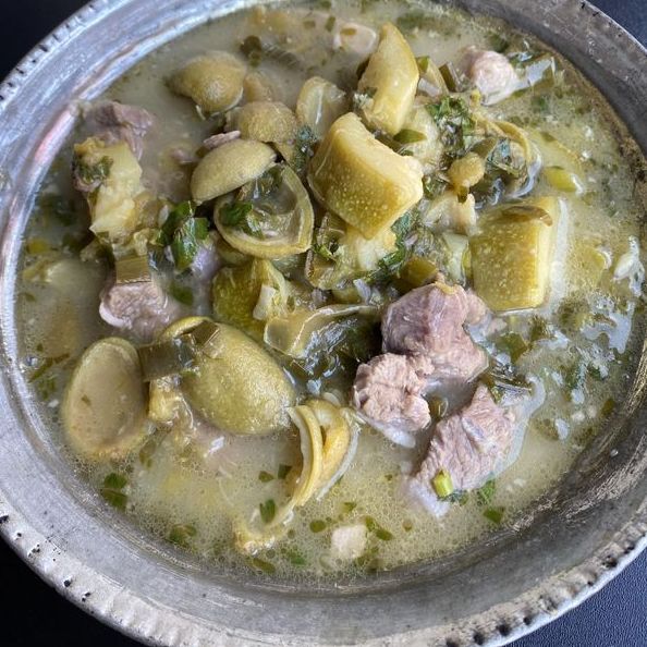 Tıkla veGörseli Büyüt:FirkiyeÖncelikle et ve çağla ayrı yerlerde haşlanır. Çağlalar haşlanmadan önce içlerindeki bademler çıkarılır, üzerlerine sıcak su dökülerek haşlanır. Haşlanan çağlalar süzülür, yarısı sıvı yağ eklenerek kavrulmuş etlerin üzerine ilave edilir. Ardından küp küp doğranmış kabaklar eklenir, tuzu atılarak kavrulur, su ilave edildikten sonra haşlanmaya bırakılır. Bu sırada çağlanın diğer yarısı süzgeçte ezilir, suyu çıkarılarak yemeğe eklenir. Süzgeçte kalan badem yemeğe aromasını bırakması için süzgeçle birlikte tencerede bırakılır. Son olarak yeşil soğan ilave edilir, tencerenin kapağı açık şekilde karıştırılmadan pişirilir. Piştikten sonra karıştırılır, limon ve maydanoz eklenip servis yapılır.
