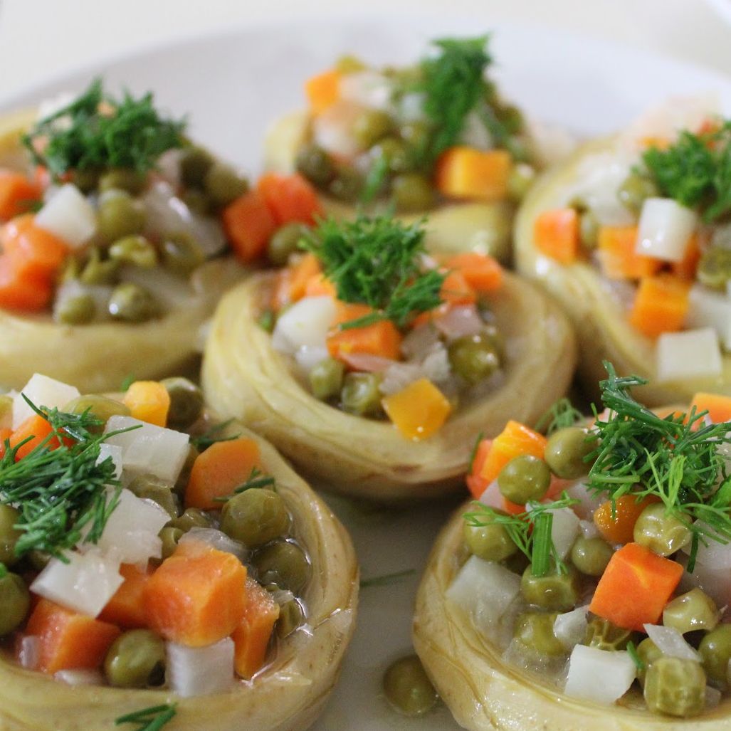 Küp küp doğranmış soğan zeytinyağında hafif pembeleşene kadar kavrulur, üzerine küp küp doğranmış ve haşlanmış patates ile havuç eklenerek kavurmaya devam edilir. Ardından 1 su bardağı bezelye ilave edilip 3-4 dakika sonra ocaktan alınır. Enginarların pişirileceği sos için limon suyu, 1 su bardağı su, toz şeker, tuz ve 2 yemek kaşığı zeytinyağı kaba alınarak karıştırılır. Geniş bir tencereye 8 adet temizlenmiş enginar yerleştirilir, üzerlerine hazırlanan garnitürden konur. Son olarak hazırlanan limonlu sos da tencereye dökülür, kapağı kapalı bir şekilde enginarlar yumuşayana kadar pişirilir.