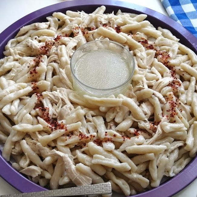 Tıkla veGörseli Büyüt:Sivas Usulü KırnişTavuğu, bir tencerede haşlayın. Etlerini ince ince diderek haşlama suyunu bir kenara ayırın. Ardından un, tuz ve su ile kulak memesi kıvamında bir hamur yoğurun. Birkaç bezeye ayırıp yufka genişliğinde açın. Tüm yufkaları, şerit şerit kesip dikdörtgen parçalar elde edin. Daha sonra hamurları parmağınızla yuvarlayıp makarnamsı bir şekil verin. Bütün hamurları, geniş bir kaba alın. 3 kepçe kadar tavuk suyu ve sarımsak ilave edip karıştırın. Didilmiş etleri de hamurların üzerine serpin. Son olarak pul biberi, tereyağında kızdırıp yemeğe ilave edin. Afiyet olsun.